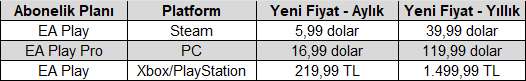 Son olarak, mütemadiyen değişiklik gösterse de bu yazının hazırlandığı dönem itibarıyla EA Play ve Play Pro aboneliklerinin fiyatlarını sizlerle paylaşalım.