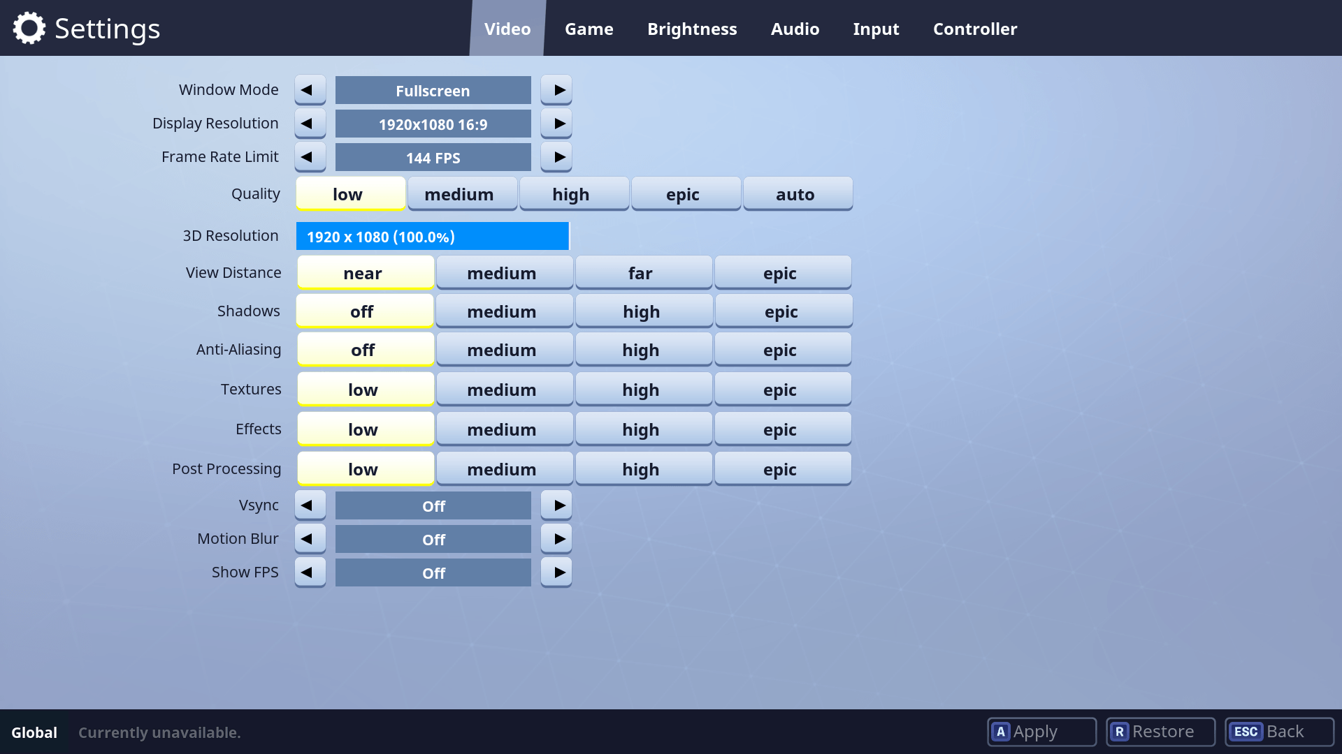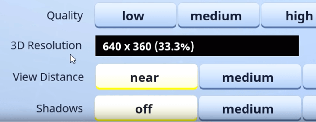 Donanım konusunda kendinizi çok yetkin görmüyor veya bilgisayarınızdaki parçalarınızı riske atmak istemiyorsanız Fornite’ın ayarlar menüsüne doğru bir yolculuğa çıkma vakti gelmiş demektir. Önceliğimiz çözünürlük. Burada hem Display Resolution hem de 3D Resolution değerlerini olabildiğince düşürün. Oyunun config dosyalarıyla oynayarak daha düşük değerler elde edebilirsiniz ama bu oyun zevkinizi biraz kötü yönde etkiler.